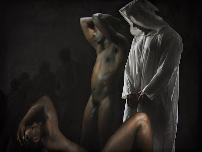 Male digital photos manipulated using several layers and done combining photographs, textures and documents and other items.